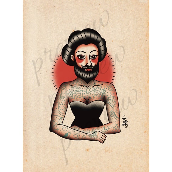 Bearded Lady Traditional Tattoo Print Old School Circus Etsy De